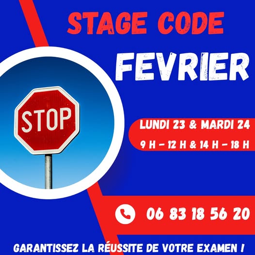 Peut être une image de texte qui dit ’STAGE CODE FEVRIER STOP LUNDI 23 LUNDI23&MARDI24 & MARDI 24 9H-12H&14H-18H 9H- 0683185620 83 18 56 20 06 GARANTISSEZ LA REUSSITE DE VOTRE EXAMEN I’